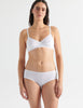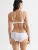The Josephine Hipster panty in white. The Antonia Bralette and Josephine Hipster in white worn by a model. woman in white cotton bralette and hipster woman in white cotton bralette and hipster