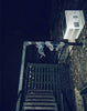 Blue silk charmeuse bralette with pink mesh yolk and matching panty dropped on fire escape.