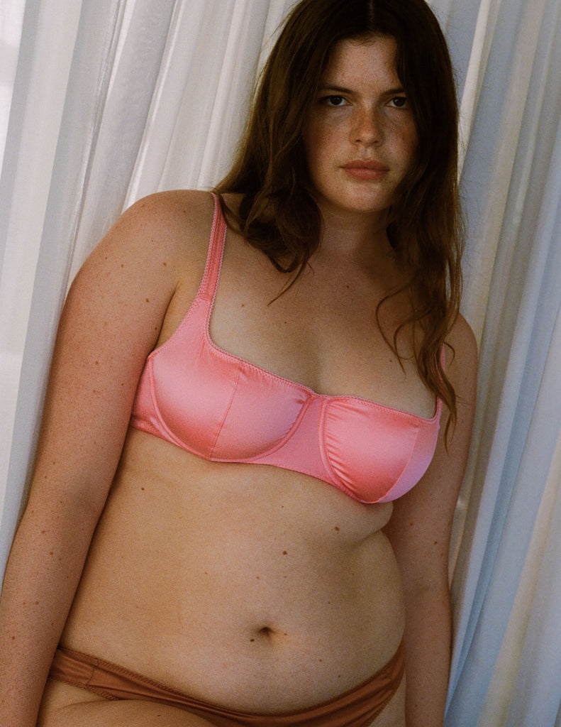 A classic balconette bra cut from shiny silk charmeuse. An underwire frame and adjustable straps offer stylish support.
