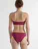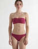 a flat lay front image of the lei bandeau in rust red brown swim suit top Close up view of the woman wearing rust red  lei bandeu bikini top Front view of the woman wearing rust red lei bandeu bikini top with leaonora bottom Back view of the woman wearing rust red lei bandeu bikini top with leaonora bottom a model wearing the louie shorts in maroon