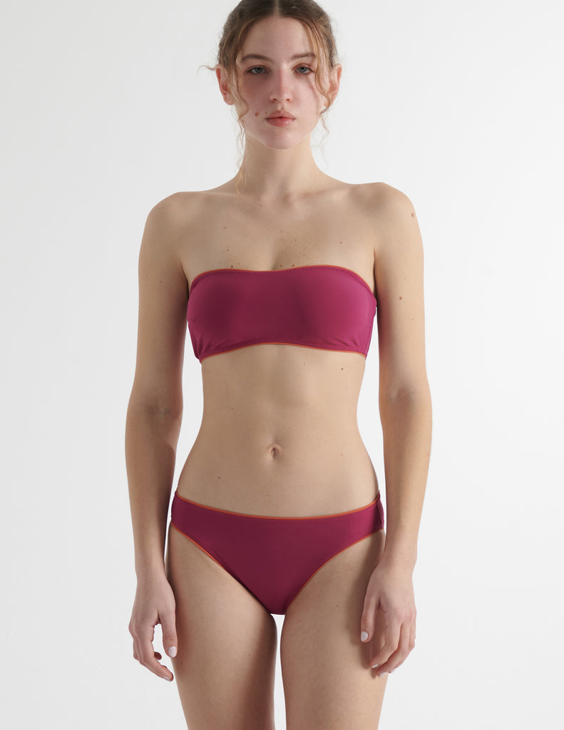 A classic bandeau outlined with chic contrast piping, this bikini top offers adaptability with its detachable straps–wear it your way, bare shouldered or with added support. Create a modern après-swim look by adding a sleek skirt or crisp pants.