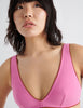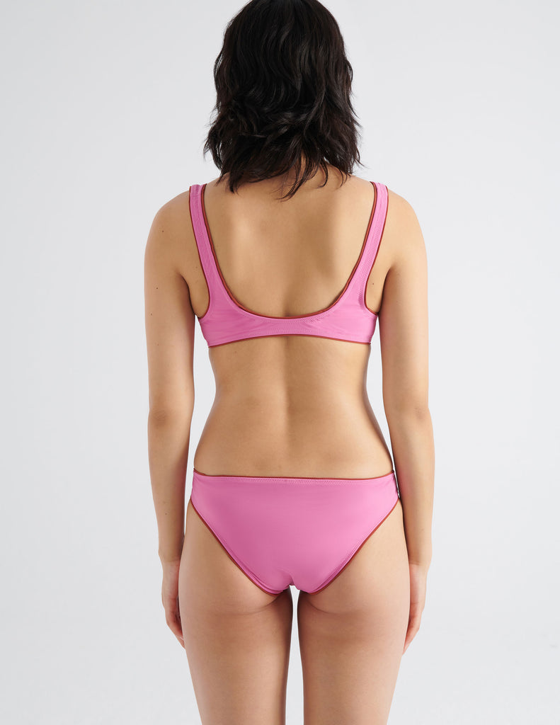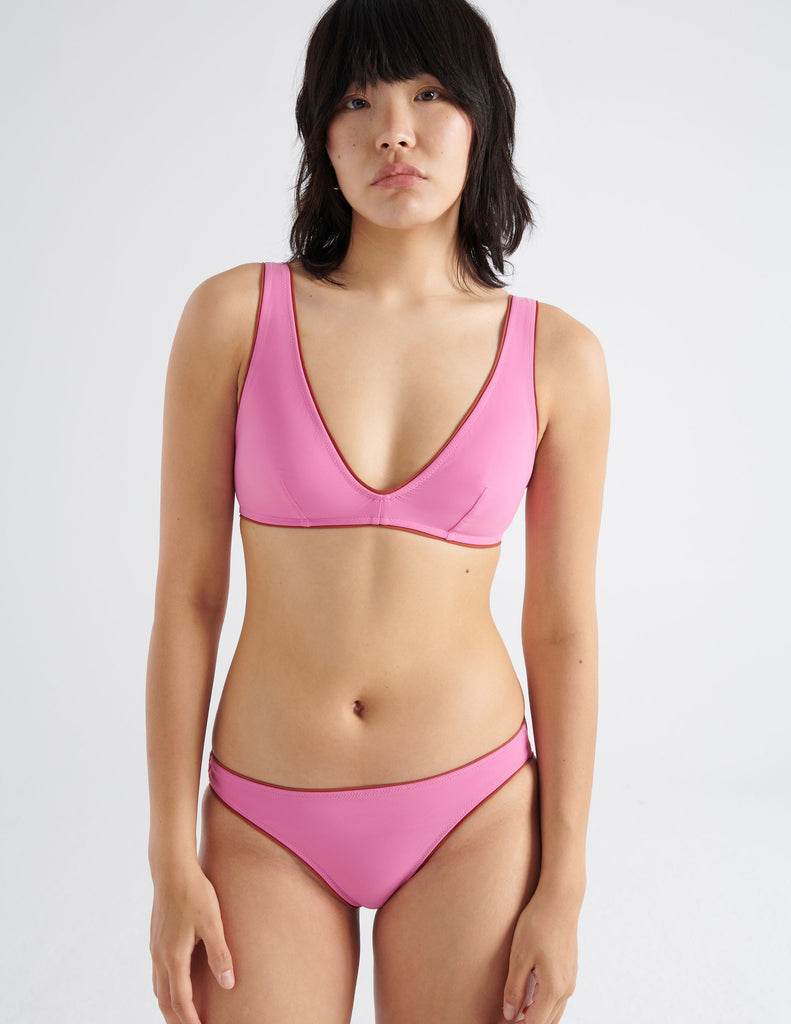 Flat image of the pink bikini top on model detail shot of pink bikini top On model image of pink bikini top and bottom On model image of the backside of the pink bikini top and bottom Flat image of the back of the pink bikini top On model, editorial image of pink bikini bottom and top in a pool