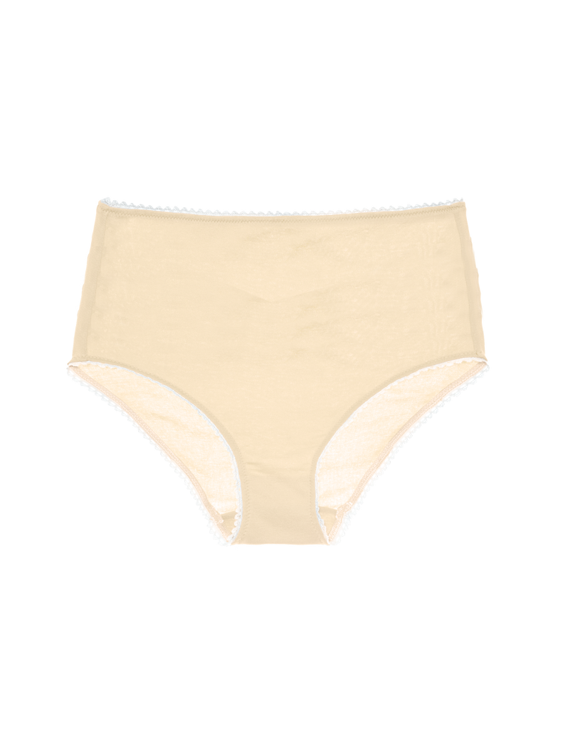 Celebrate the raw beauty of natural cotton with the the Mabel Hipster, a high-rise medium coverage panty traced with a soft crochet trim, crafted from undyed and untreated deadstock cotton fabric.