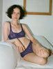 a purple lace bra with elastic on bottom by Araks front view of woman in purple bra and panty detail of purple bra back view of purple bra and panty woman wearing dark purple stretch lace soft cup bra and matching hipster woman wearing dark purple stretch lace soft cup bra